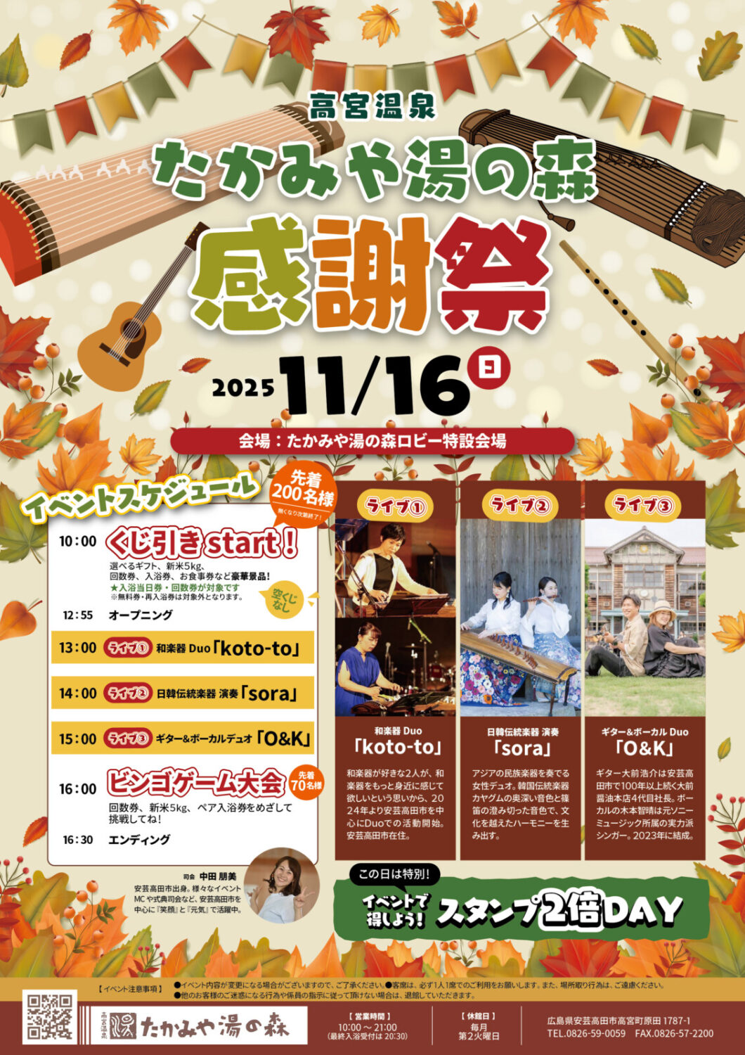 ご入浴いただくと、先着200名様限定で新米5㎏、選べるギフト、回数券やお食事券が当たるくじ引きに参加できる特別な日です。音楽ライブイベントも開催。楽しいひとときを、ご家族やお友達と一緒にぜひお過ごしください。