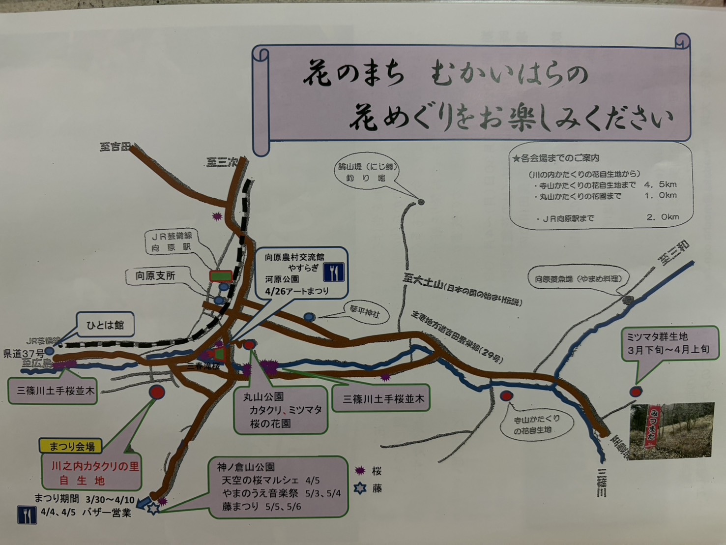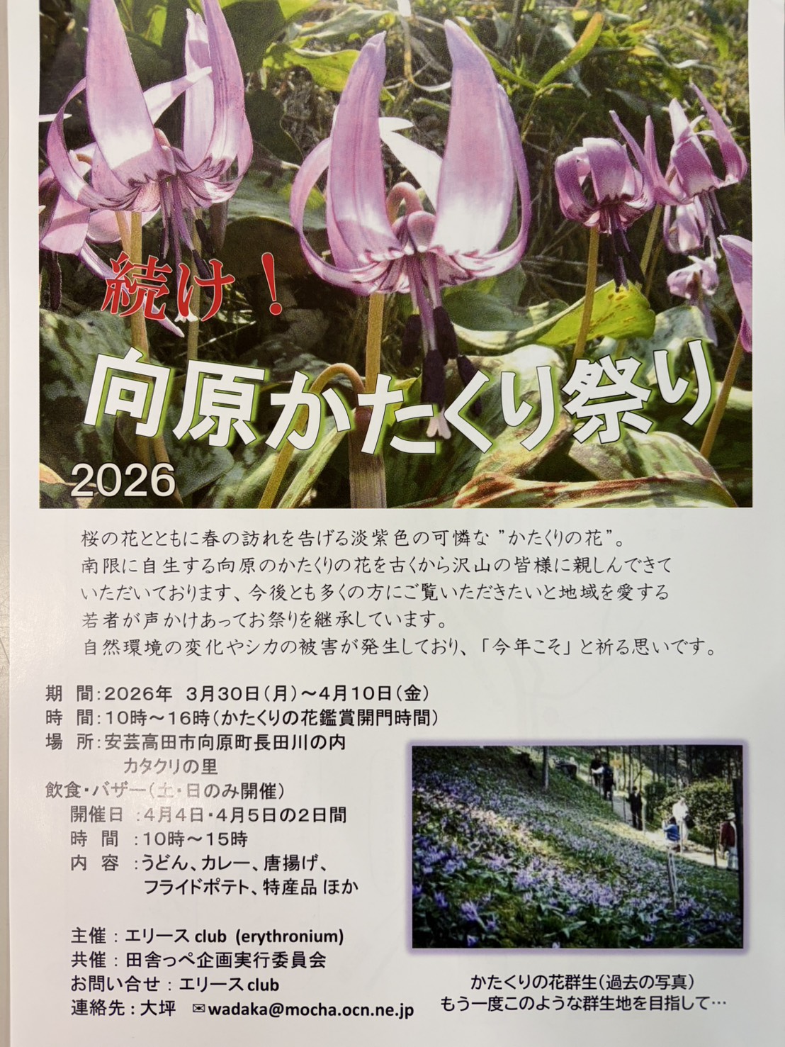 そんなカタクリの里では、毎年カタクリの開花時期に合わせて「向原かたくり祭り」を開催しており、カタクリの花のほかにも、4月4日・5日の2日間には飲食・バザーなども楽しむことができます。